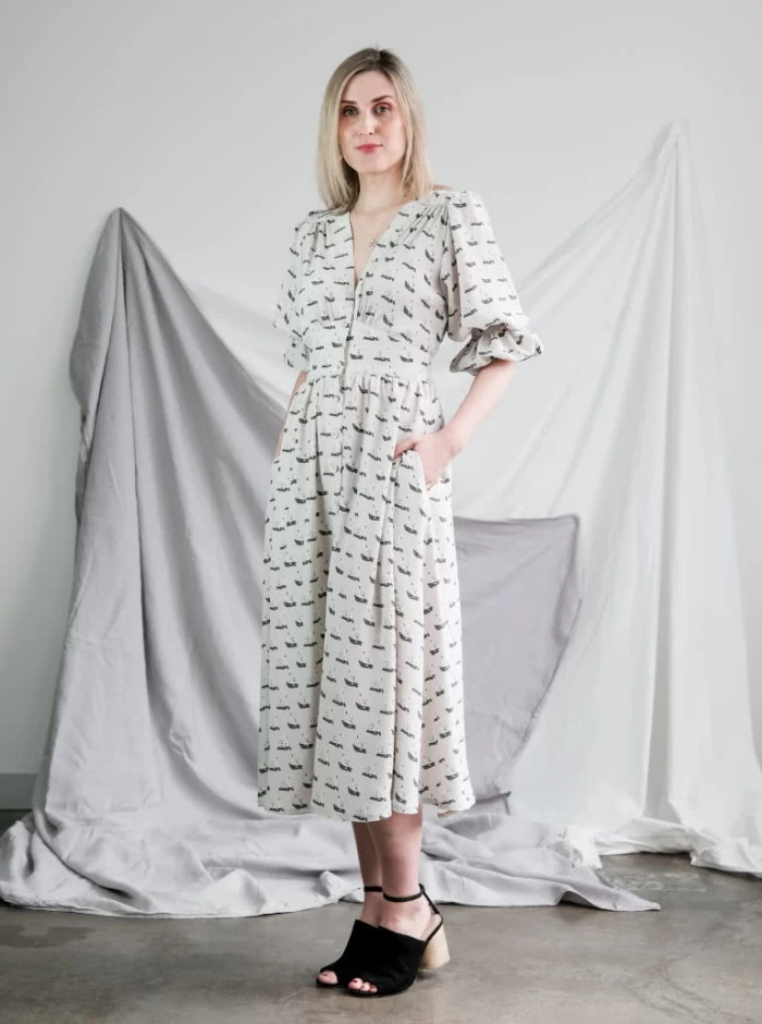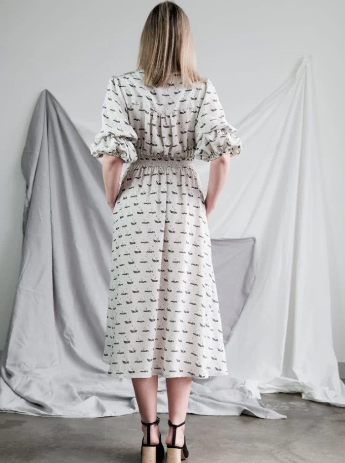 The Belle dress pattern offers a charming button-through design with sleeves, making it a versatile and stylish choice. The back of the dress features shirring at the waist, providing ease and comfort over the bust and waist areas. The dress showcases a beautiful “V” neck shape, adding a touch of elegance. The 3/4 sleeves are adorned with a mid-shirring feature and elastic opening, offering a unique and feminine detail. With a double front waist yoke and gathered bodice, skirt, and sleeve head, this dress creates a flattering silhouette.