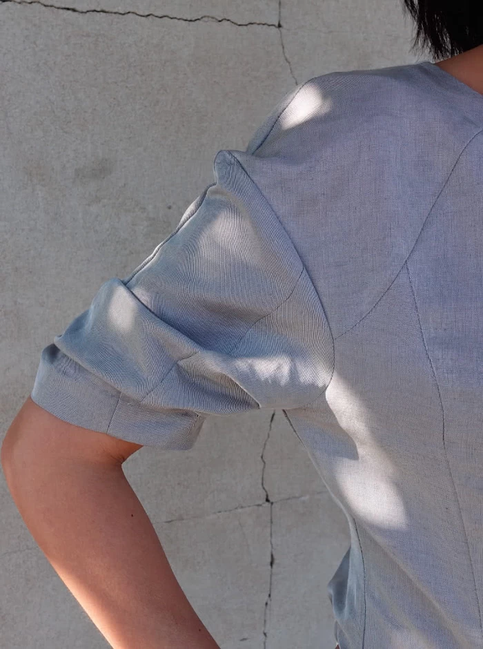 Introducing the designer dress with its signature feature, the reverse inverted pleats, which bestow it with a distinct and eye-catching shape. The dress boasts a fitted bodice that beautifully accentuates the figure, combined with a dropped shoulder for a touch of relaxed elegance. The engineered sleeve showcases its unique shape, achieved through skilfully crafted under-sleeve tucks.