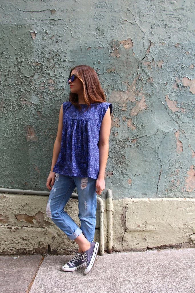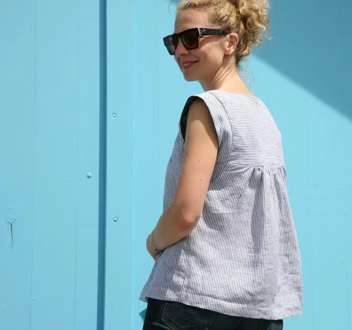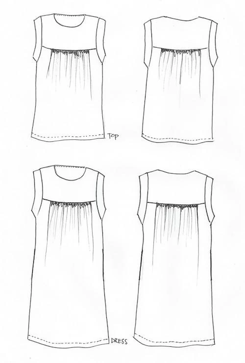The Alice Dress/Top is designed in a smock style, characterised by a self-lined yoke bodice with shaped armhole bands, and a gently gathered body on both the front and back. Additionally, the dress iteration comes equipped with side pockets for added functionality.