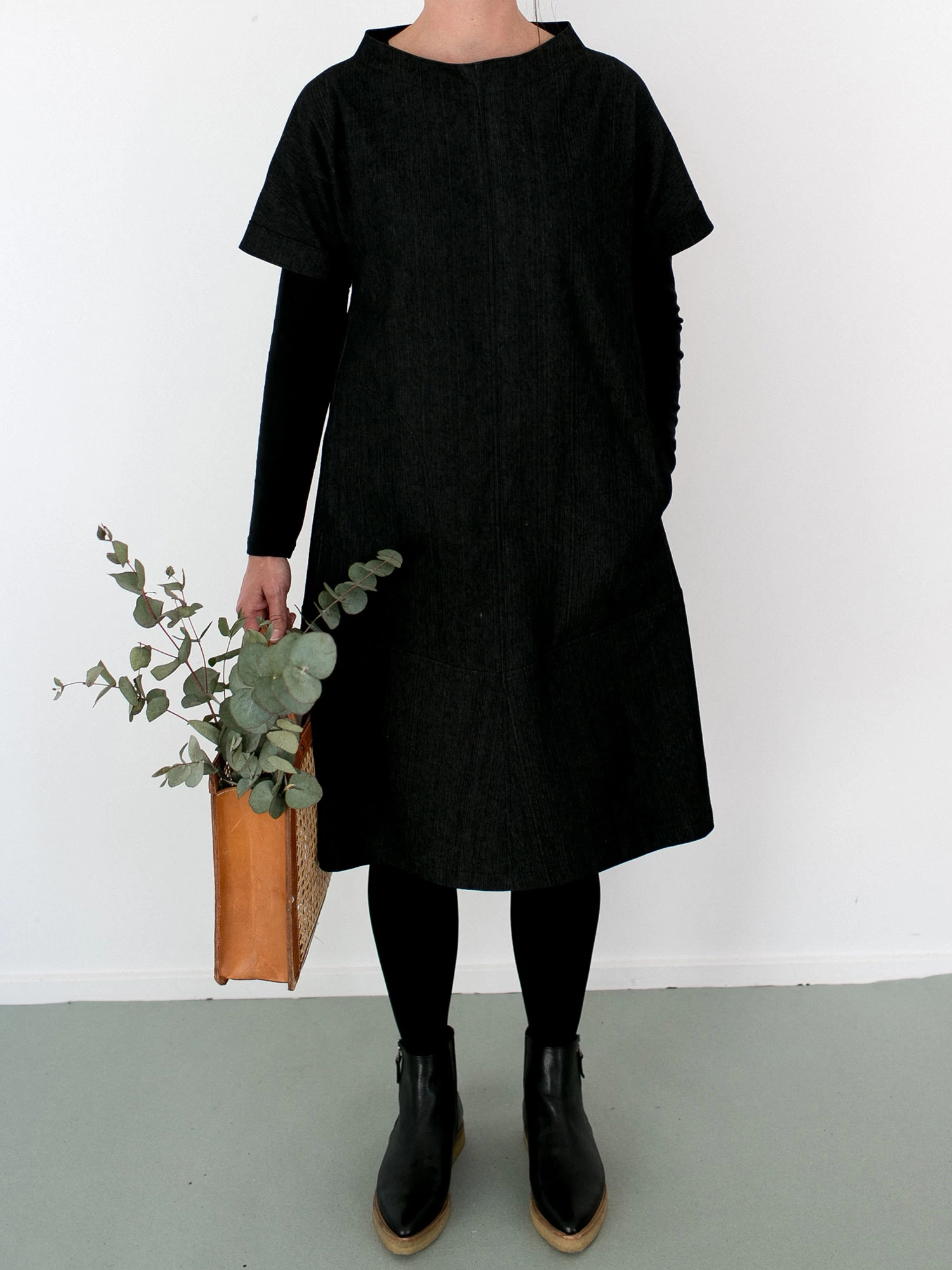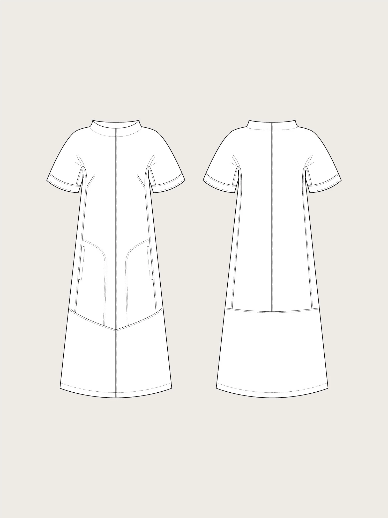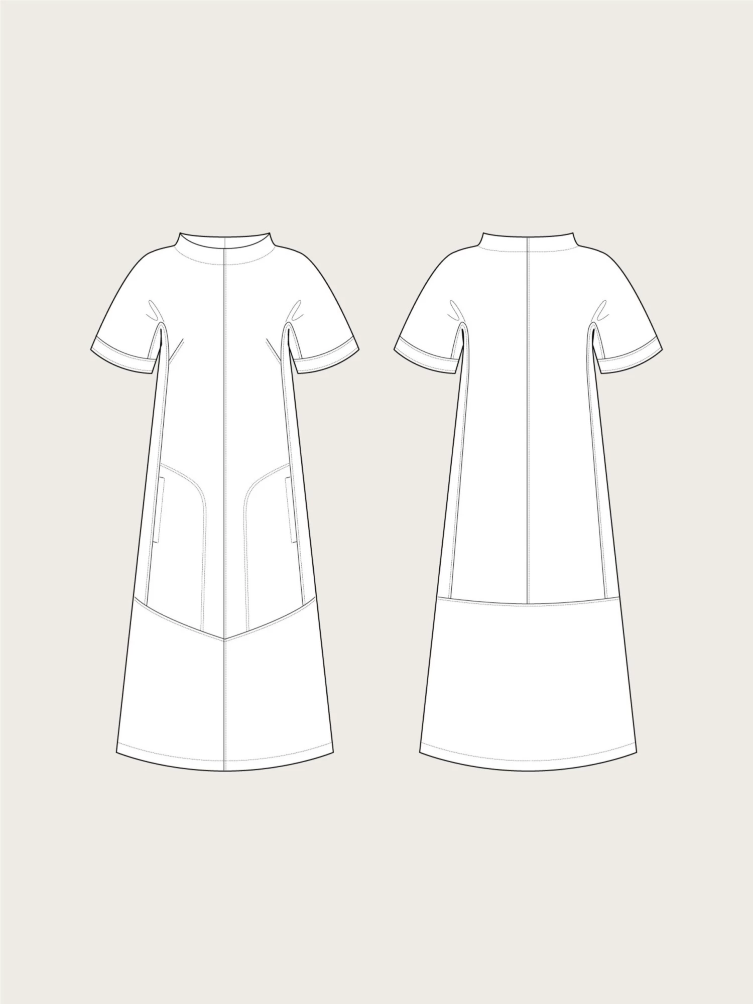With its clean lines and subtle sixties vibe, The Cap Sleeve Dress is a stylish choice for any occasion. It is a slip-on garment that includes a cowl neck and cap sleeves for added comfort. The dress also features a decorative in-seam gusset that runs all the way under the arms, adding an interesting detail to the design. In addition, the dress includes large front pockets.