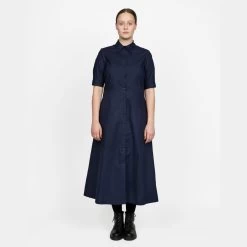 The Shirt Dress pattern features an A-line silhouette that falls at mid-calf length, with a regular collar and front button placket. It includes two cuff sleeve options and practical side seam pockets.