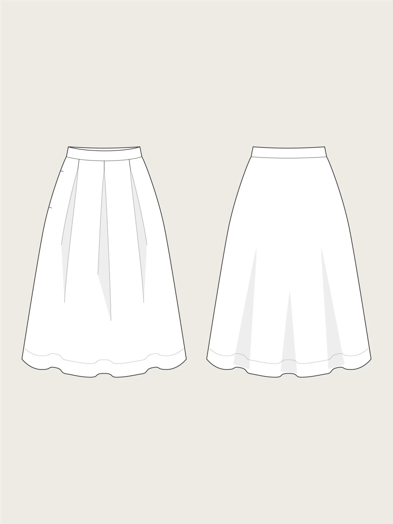 With its pleated front and plain back, the Three pleat skirt sewing pattern offers a flattering and stylish fit. The skirt comes equipped with a handy right side pocket and a left side zipper opening for ease of wear.