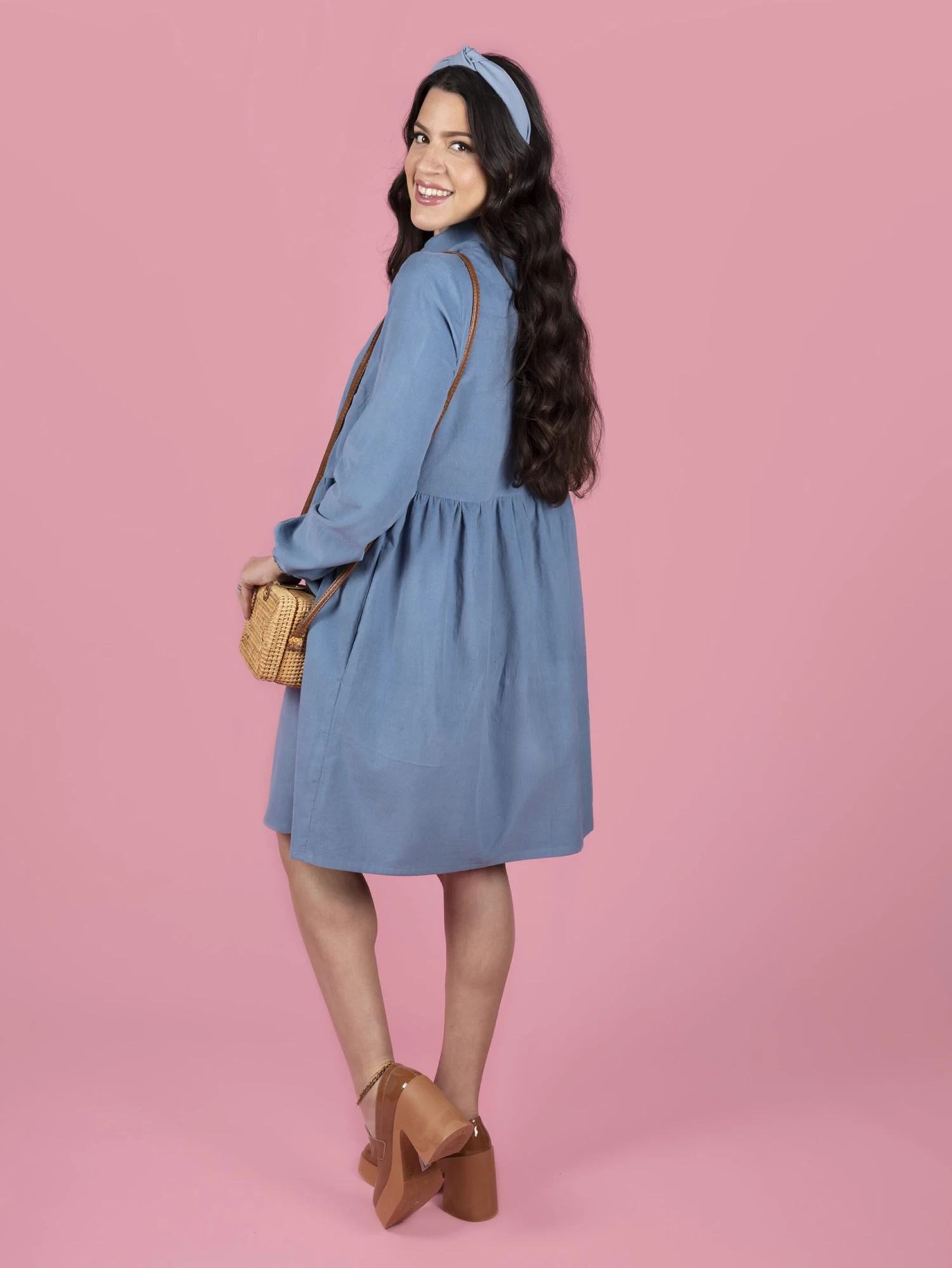 Effortlessly glide in contemporary flair wearing this trendy dress. Infinitely adaptable, opt for breezy cotton in summer, cosy needlecord in winter, or flowy viscose for added elegance. The comfortable bodice features bust darts and a button-front opening, complemented by a timeless two-piece collar and stand.