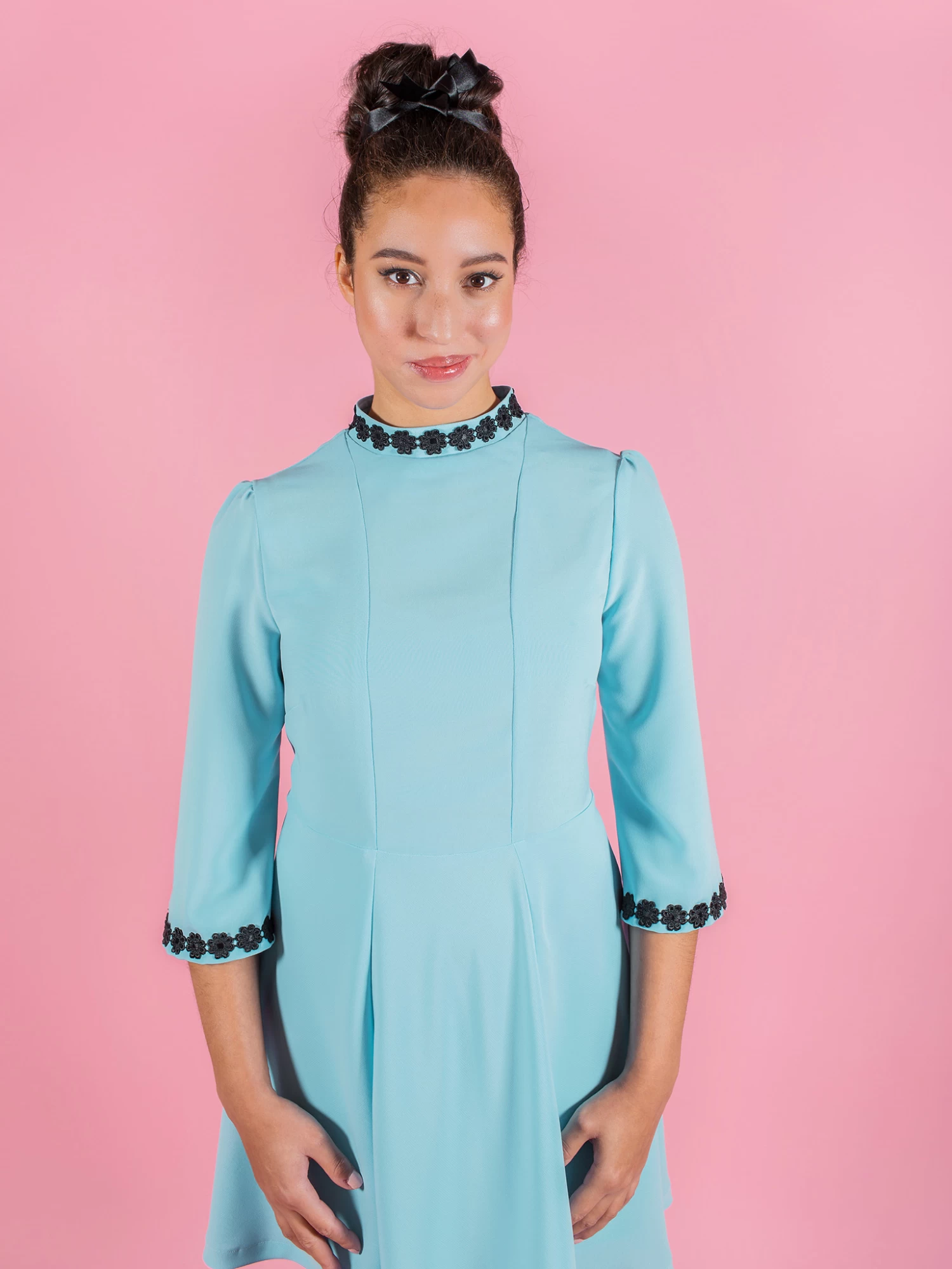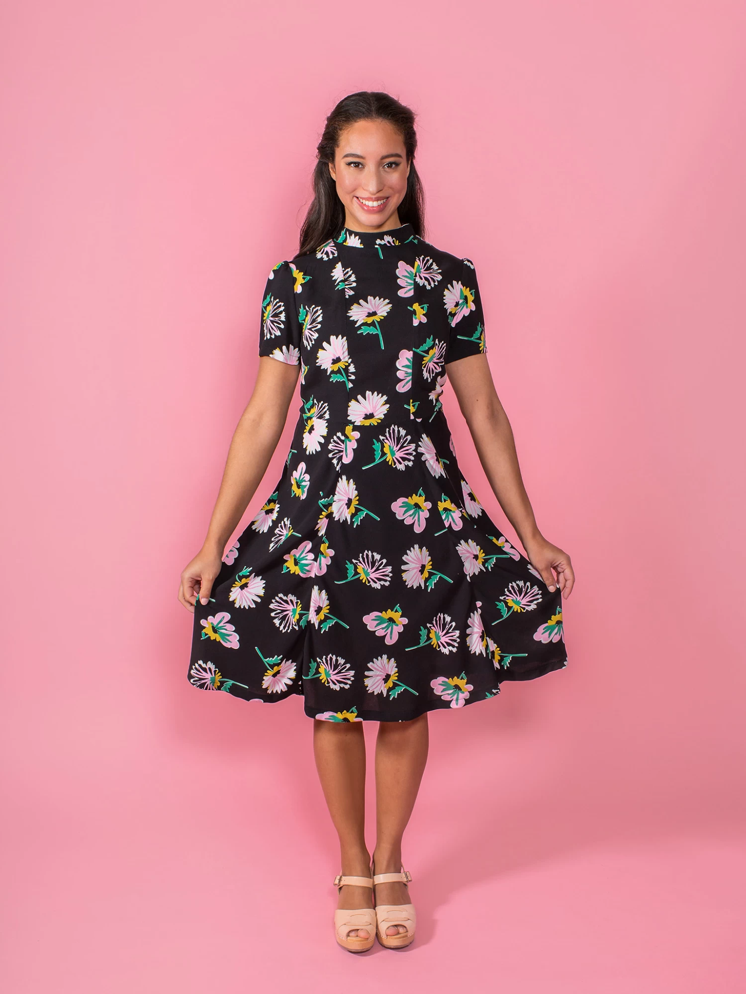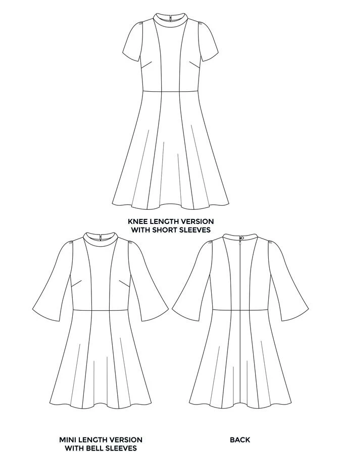 The Martha dress reimagines the fit-and-flare style for the modern era. Highlighting a high neck band, figure-flattering princess seams, and a bias-cut flared skirt, it secures elegantly with an invisible zip at the back. Customize with short or bell sleeves and knee-length or mini hemline. Perfect for playful twirls!