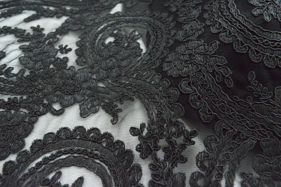| 140cm wide. Net border is a fairly delicate net upon which is embroidered floral pattern with plenty of the sheer net in evidence, this comes in black on a black net background. | |