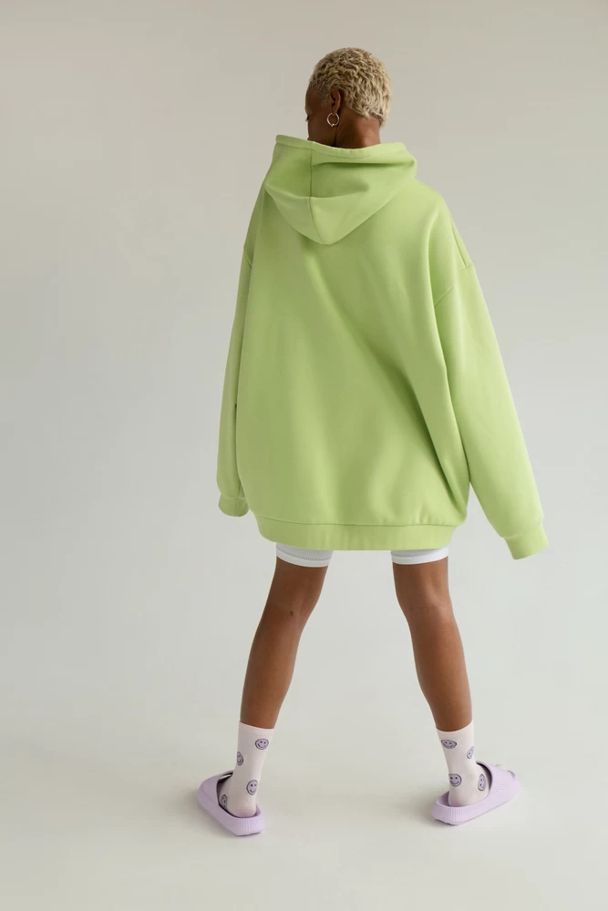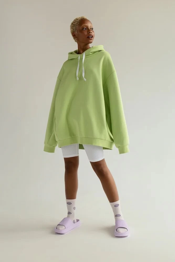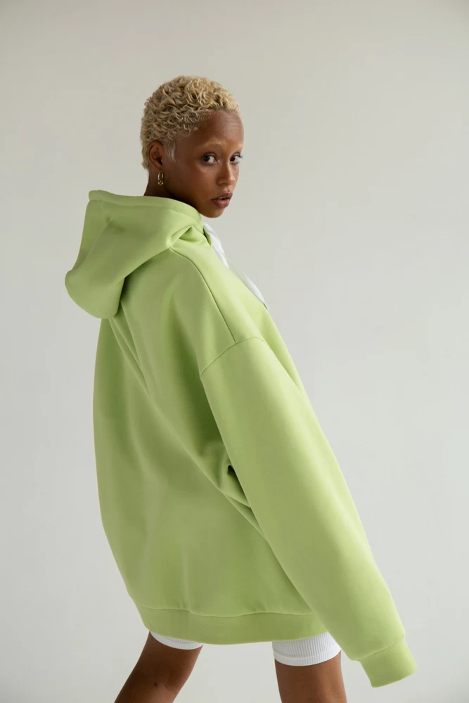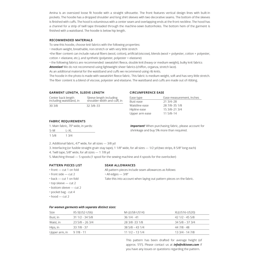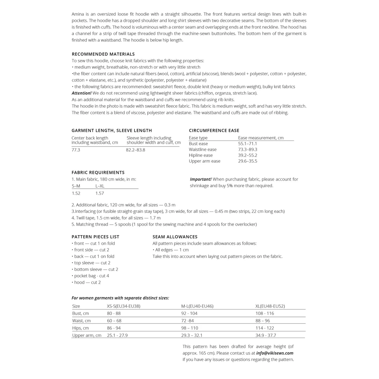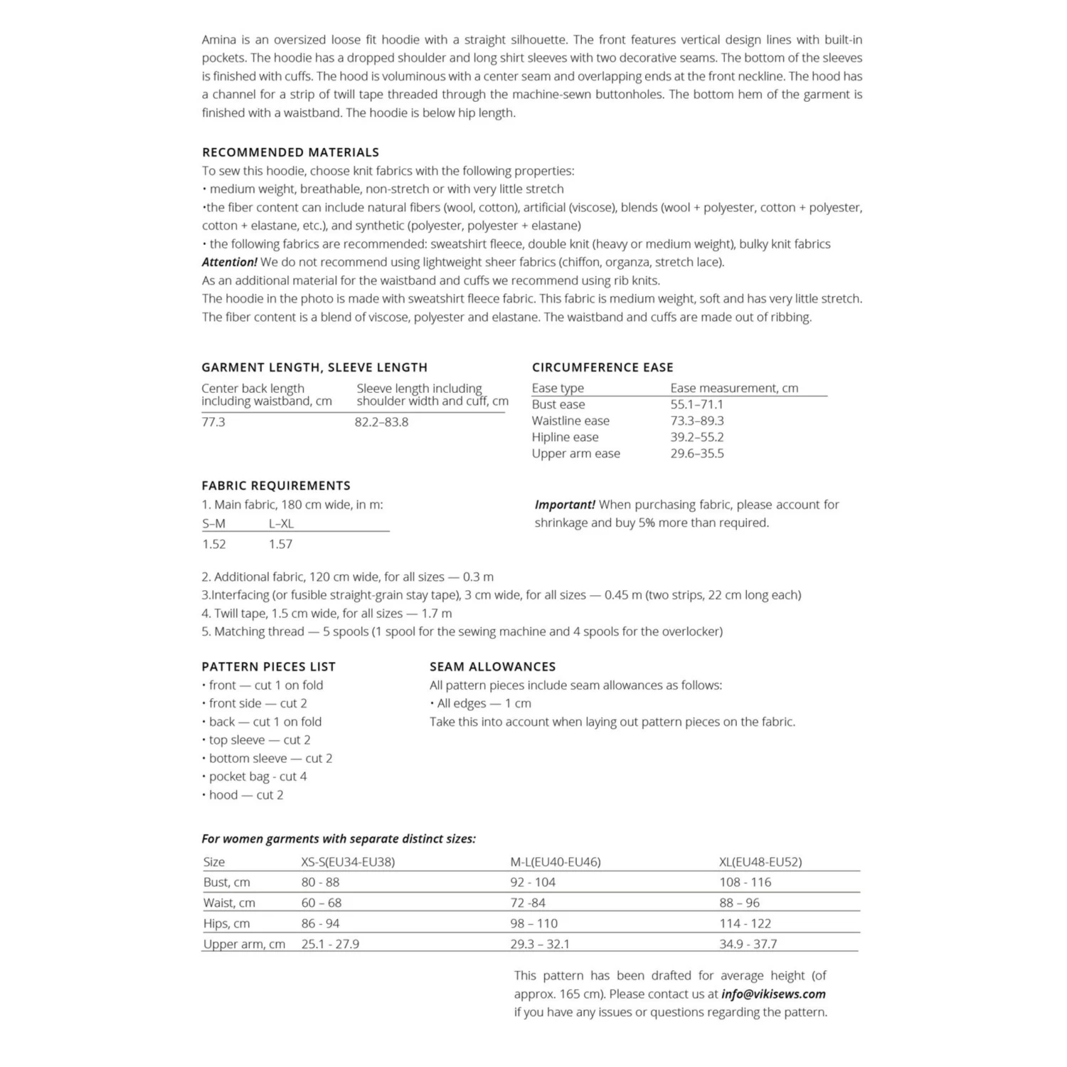 Amina is a generously-sized, relaxed-fit hoodie with a straight, unfussy silhouette. Its front showcases vertical design elements, complete with integrated pockets. The hoodie boasts a dropped shoulder and lengthy shirt sleeves detailed with twin decorative seams, ending in neat cuffs. The roomy hood features a centre seam and overlapping sections at the front neckline, equipped with a channel for twill tape to be threaded through the machine-sewn buttonholes. Amina’s lower hem is neatly finished with a waistband, and the hoodie’s length extends just below the hip.