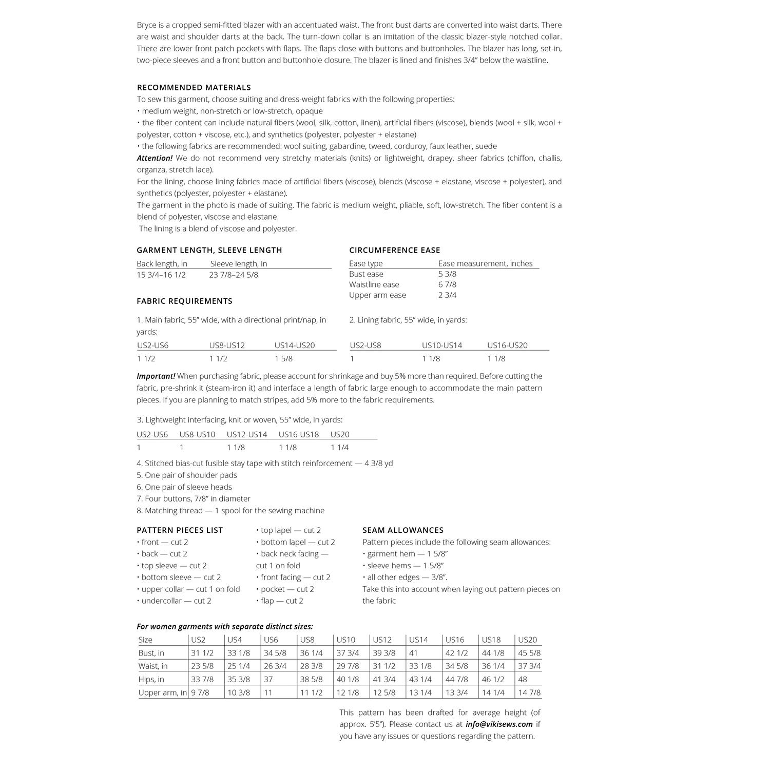 Bryce is a cropped, semi-fitted blazer designed to highlight the waist. Front bust darts transition into waist darts, while back features waist and shoulder darts. The classic blazer-style notched collar enhances the design. Lower front patch pockets with buttoned flaps add flair. With long, set-in, two-piece sleeves and a front button and buttonhole closure, it’s fully lined and finishes 2cm (3/4″) below the waistline.
