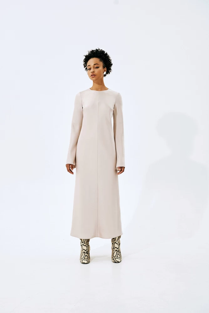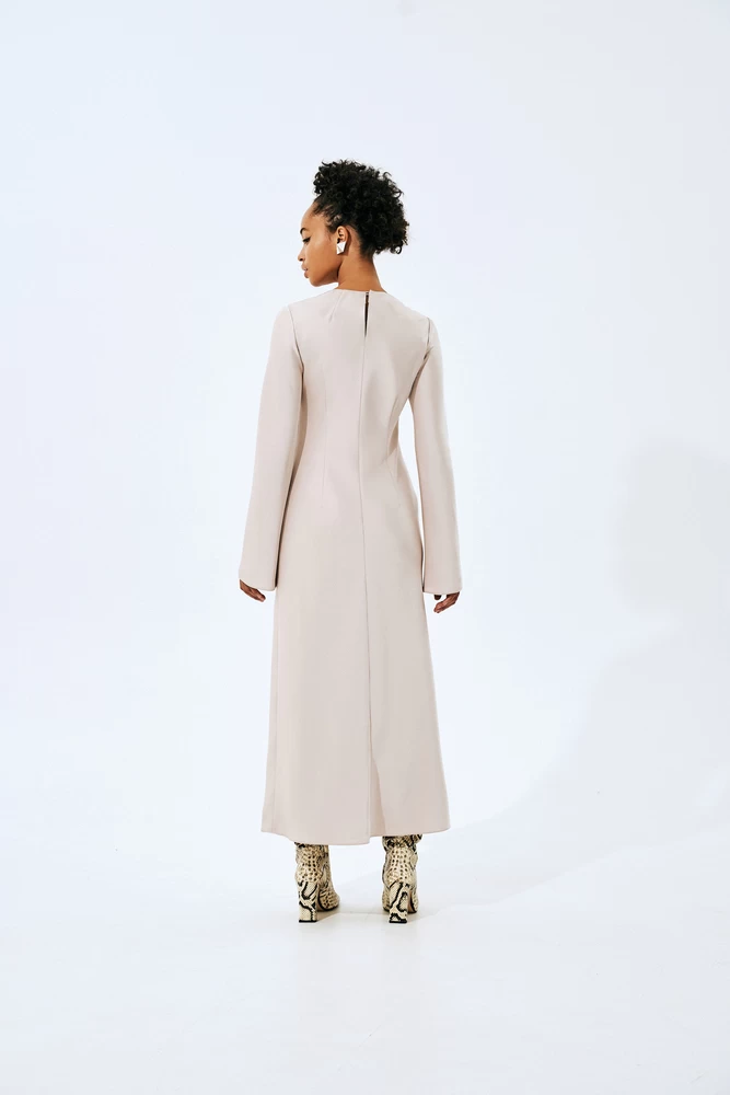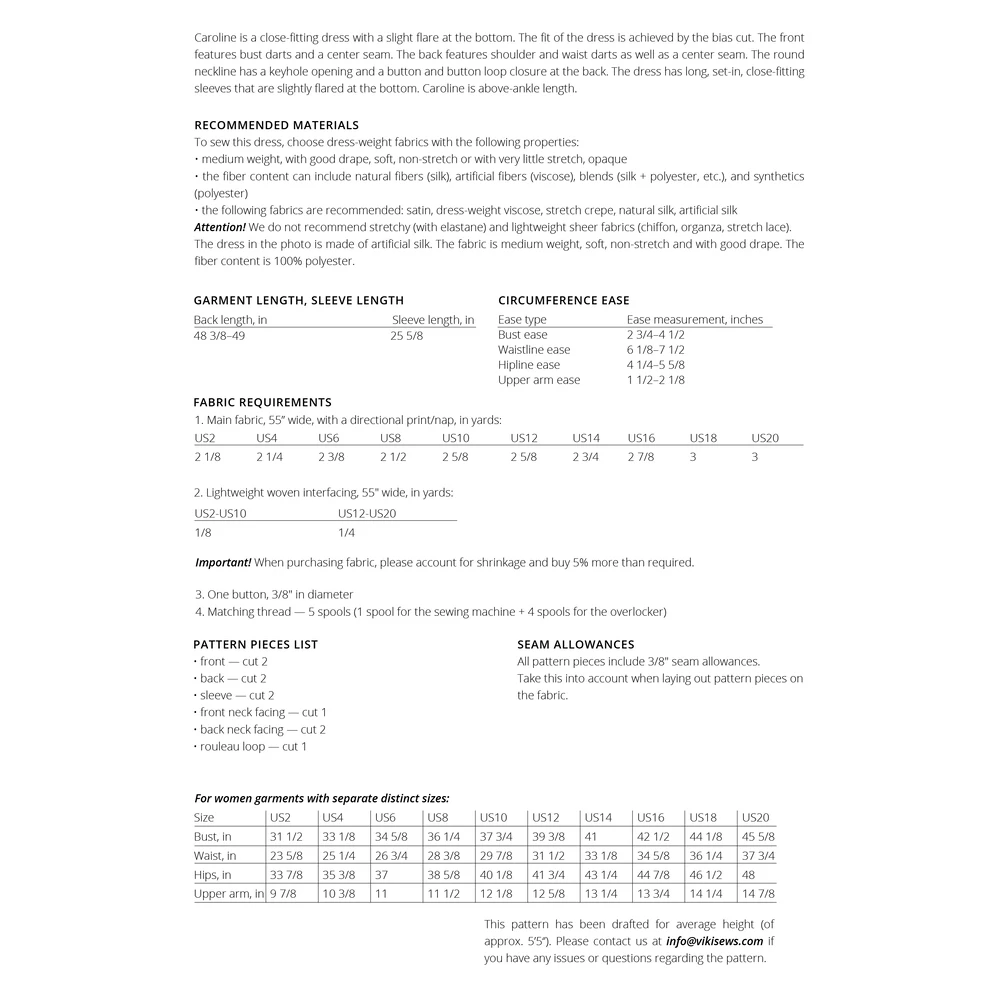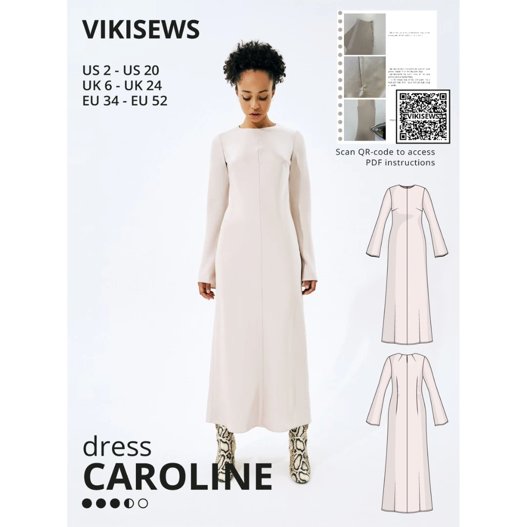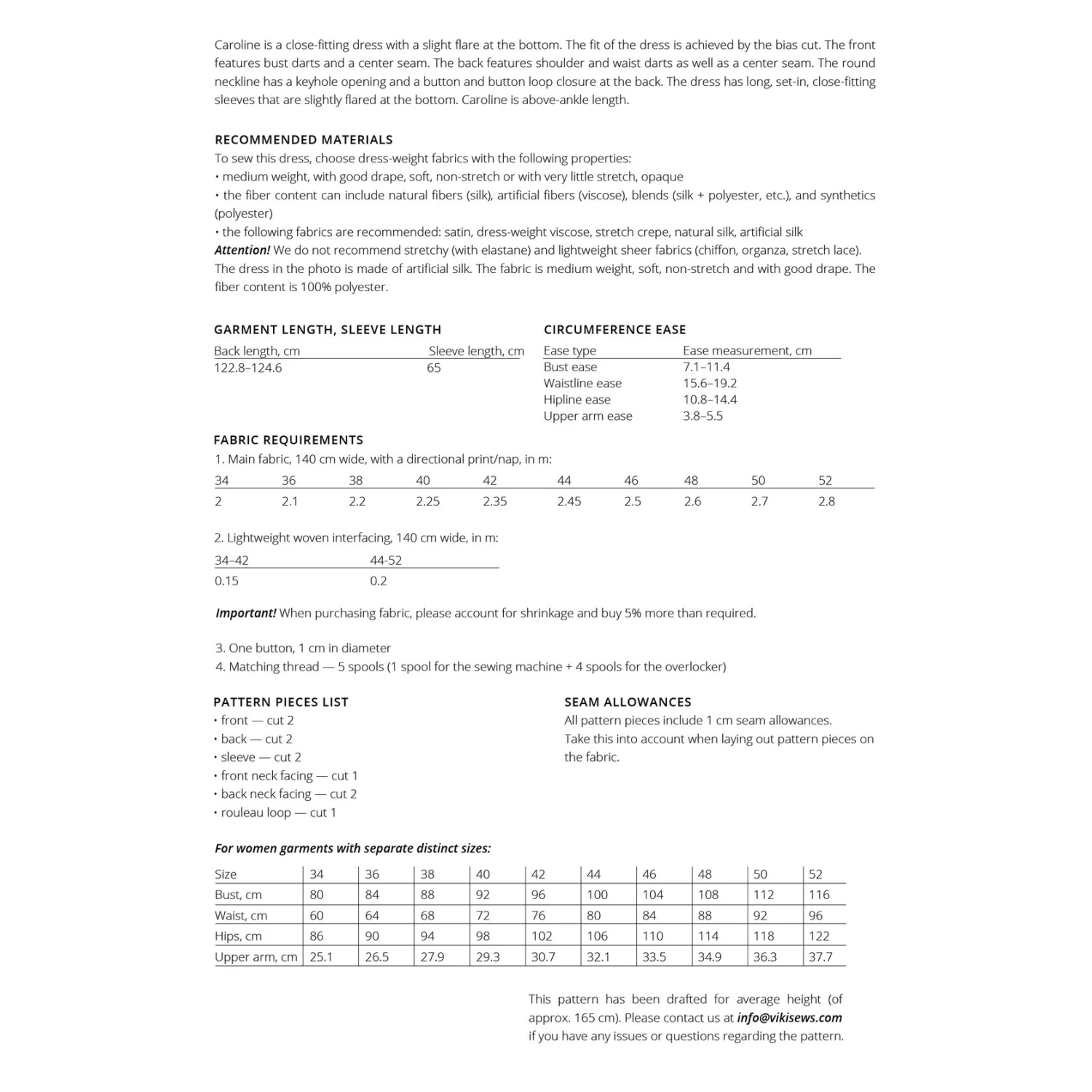 Caroline is a figure-hugging dress with a gentle flare at the hem, achieved through bias cutting. Its front showcases bust darts and a central seam, while the back boasts shoulder and waist darts, and another central seam. The round neckline features a keyhole opening and a button with a button loop closure at the back. The dress is elegantly finished with long, close-fitting sleeves that gently flare at the cuffs. Caroline gracefully falls to above-ankle length.