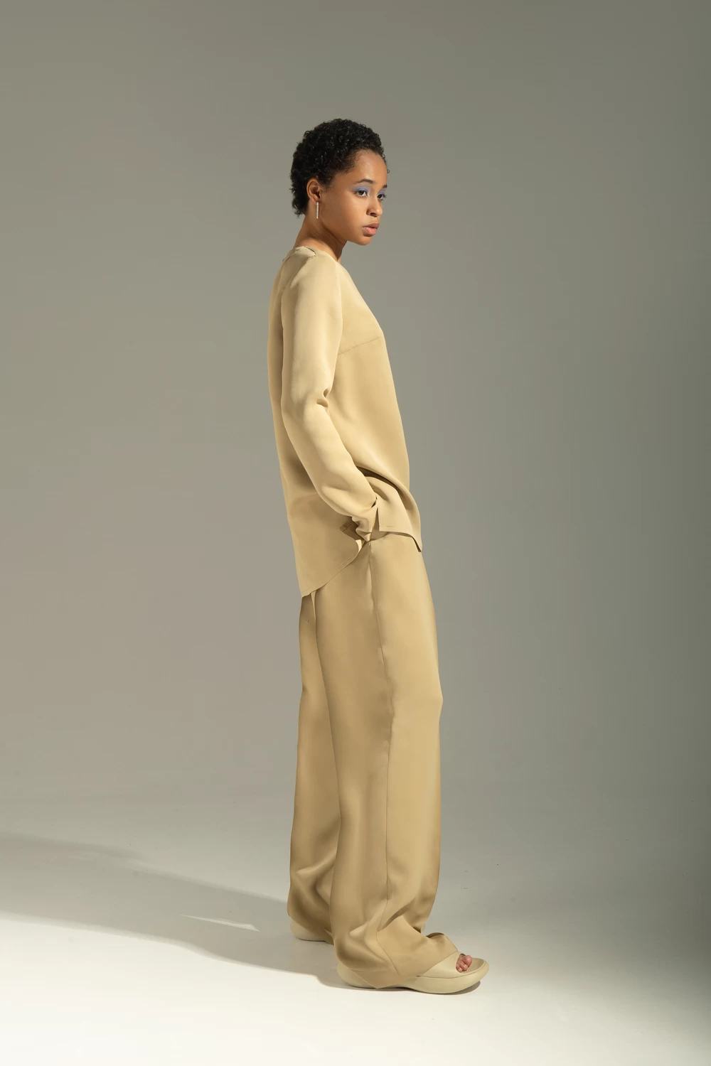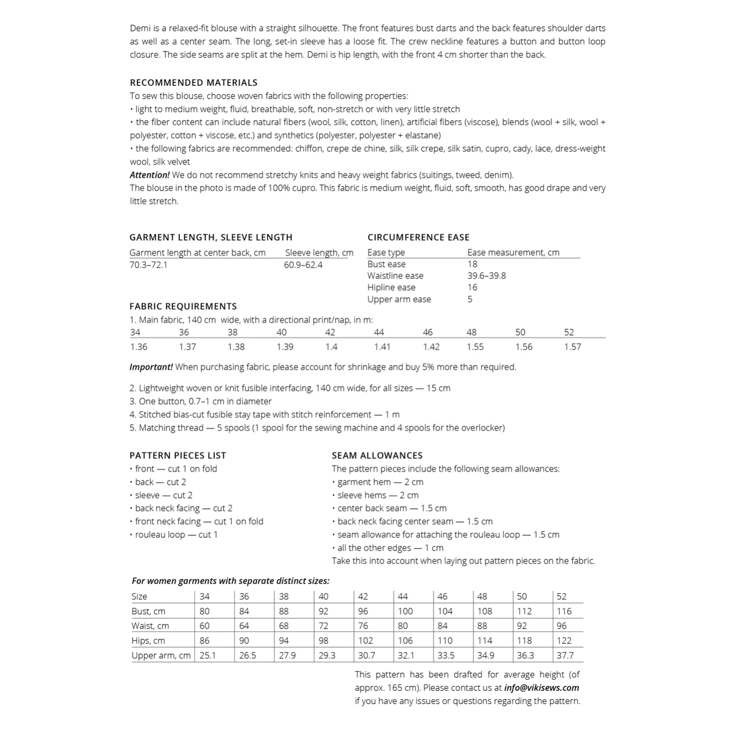 Demi is a laid-back, loose-fit blouse characterised by a straight silhouette. It incorporates bust darts in the front and shoulder darts along with a central seam in the back. The long, set-in sleeves offer a relaxed fit, while a crew neckline with a button and button loop closure adds a stylish touch. The side seams are slit at the hem, and Demi falls to hip length, with the front being 4cm (1 5/8″) shorter than the back.