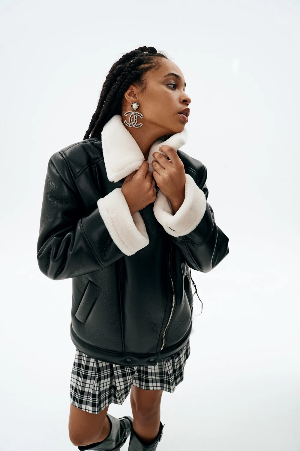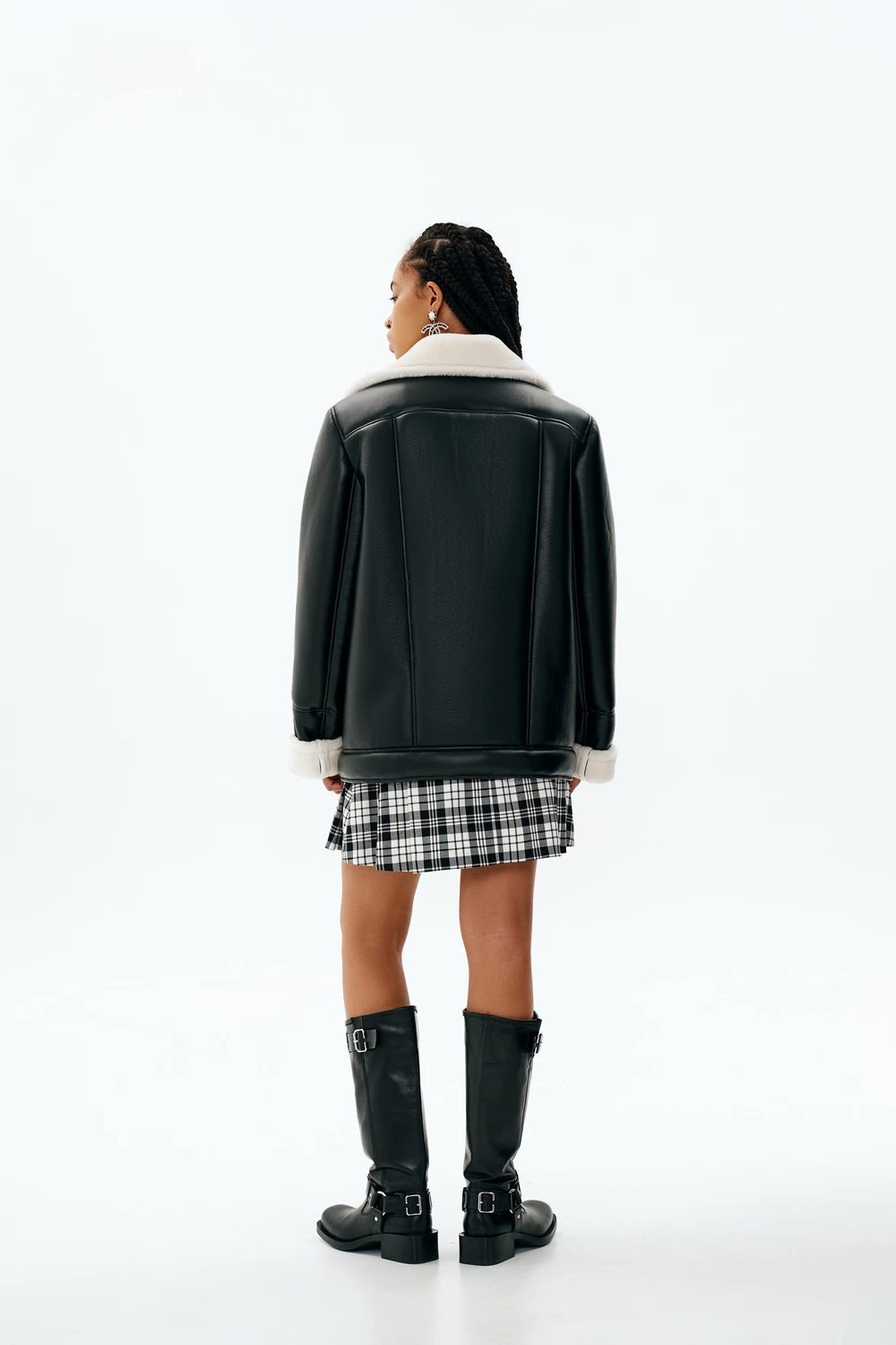 Eiza is a semi-fitted shearling jacket with an extended shoulder and a straight silhouette. It showcases yokes, princess seams, and welt pockets on the front. The off-centre zipper adds character, while the back features a yoke and princess seams. The two-piece set-in sleeves come with turn-back cuffs, and the jacket is finished with a turn-down collar and a snap-closed waistband. Eiza’s decorative top stitching enhances its style, and it falls gracefully to below-hip length.