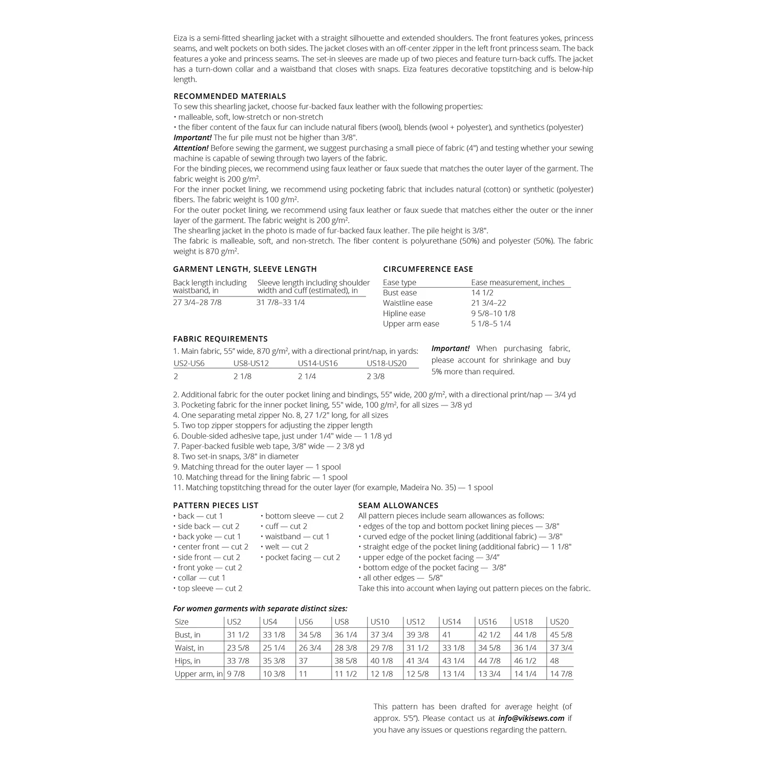 For the binding pieces: Faux leather or faux suede that matches the outer layer of the garment. The fabric weight is 200 g/m2.