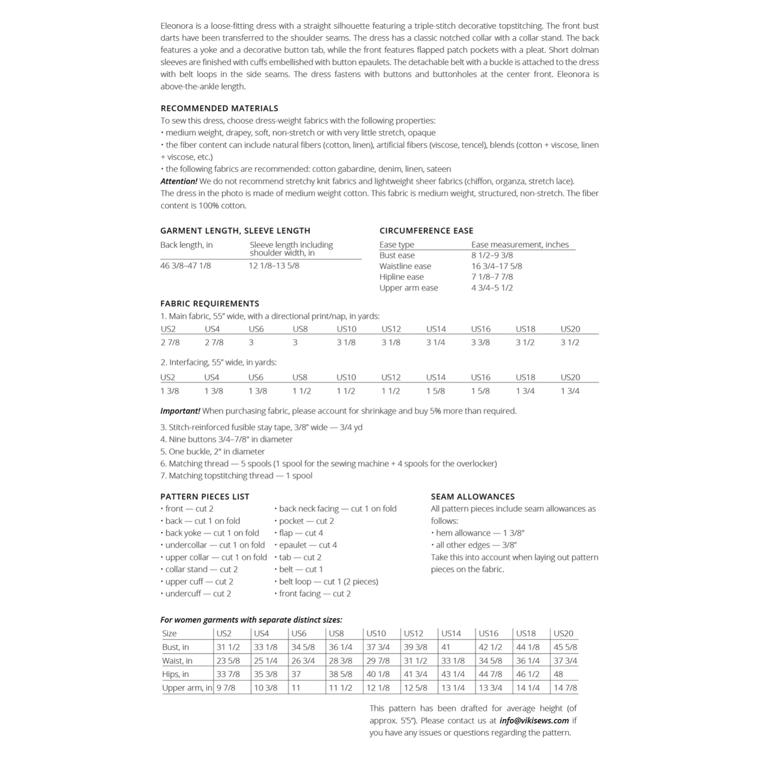 Eleonora is a loosely-fitted dress, characterised by straight lines and triple-stitch decorative top stitching. The front bust darts have been relocated to the shoulder seams, complementing the classic notched collar with a collar stand. The back features a yoke and a stylish button tab, while the front boasts flapped patch pockets with pleats.