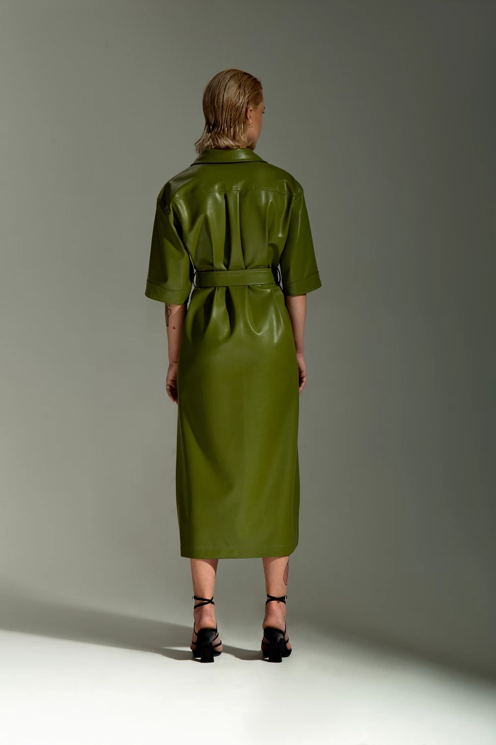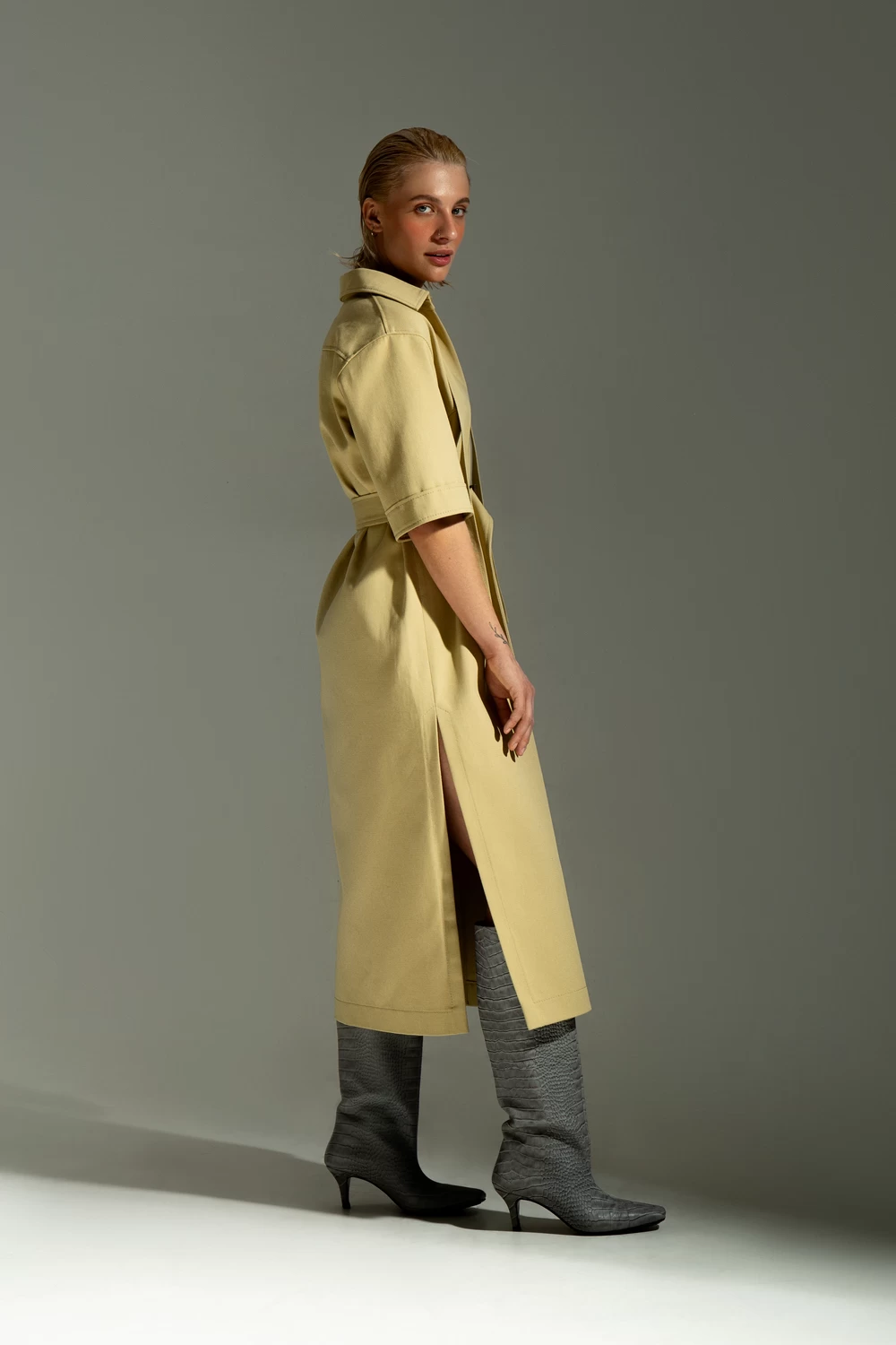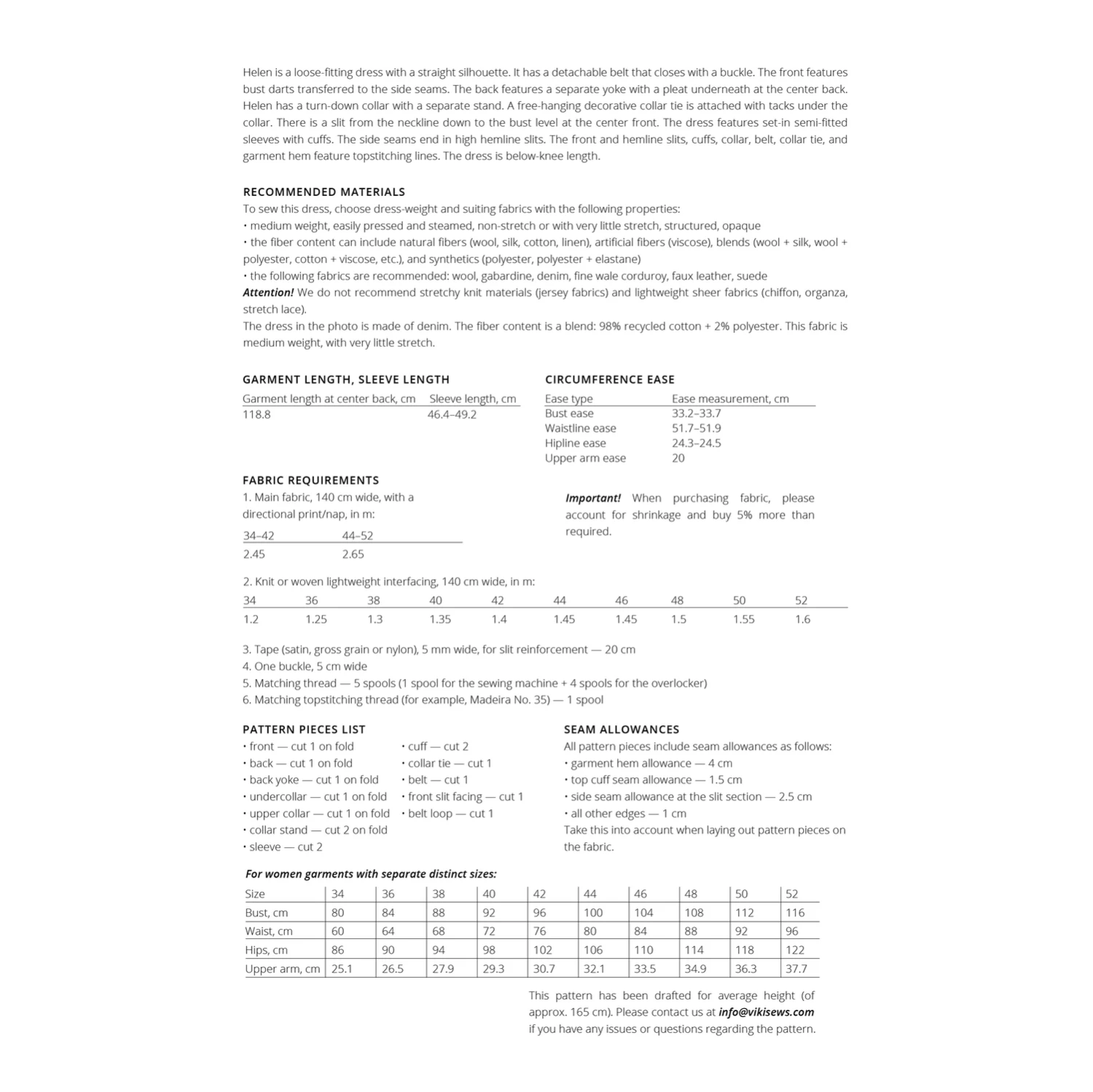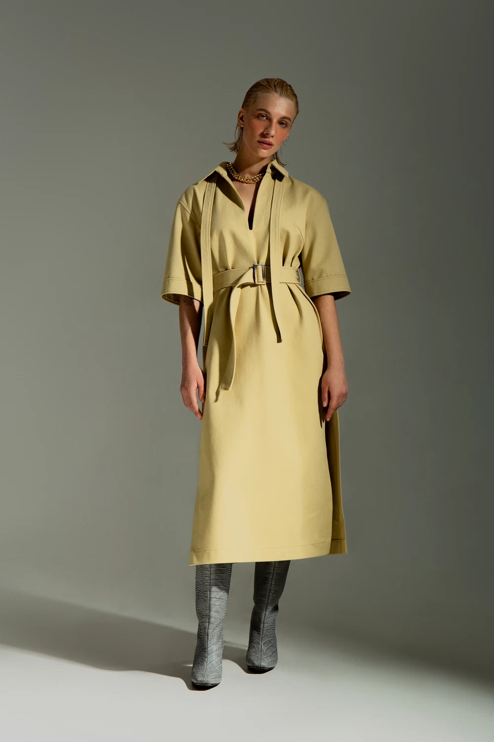 Helen is a loose, straight silhouette dress with a detachable buckle belt. It includes bust darts at the front and a yoke with a pleat at the back. Featuring a turn-down collar with a separate stand, it comes with a decorative collar tie attached underneath. There’s a front neckline slit to the bust level, semi-fitted sleeves with cuffs, and high hemline slits at the side seams. Top stitching accents adorn the collar, cuffs, belt, collar tie, and hem. The dress falls below the knee.