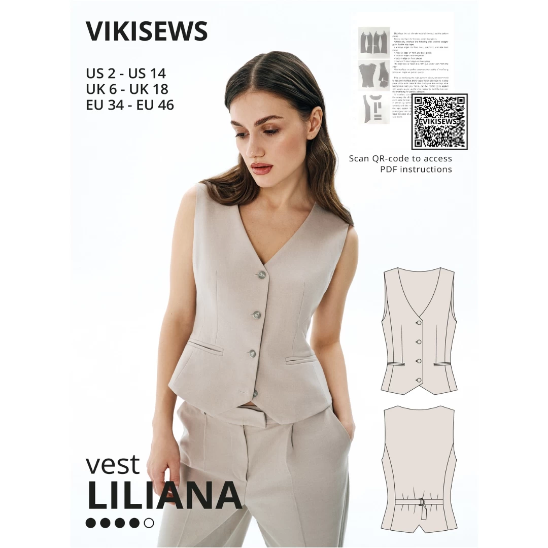 Liliana is a semi-fitted vest, featuring bust darts relocated to the princess seams and double welt pockets. The back includes shoulder darts, princess seams, and waist-cinching tabs with D-ring fasteners. An inverted V-shaped detail graces the back hem. Fastened with four buttons and buttonholes, Liliana is fully lined and sits at a high-hip length.