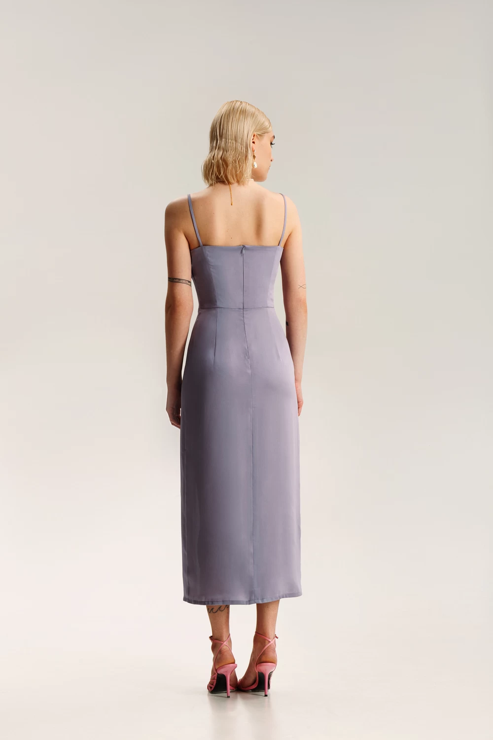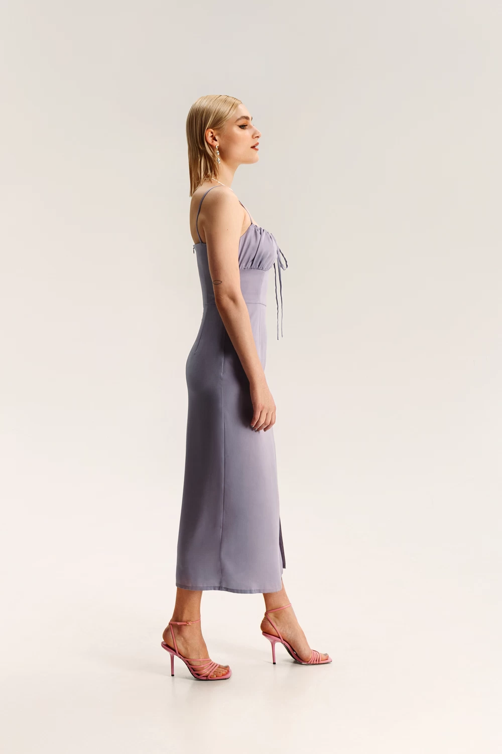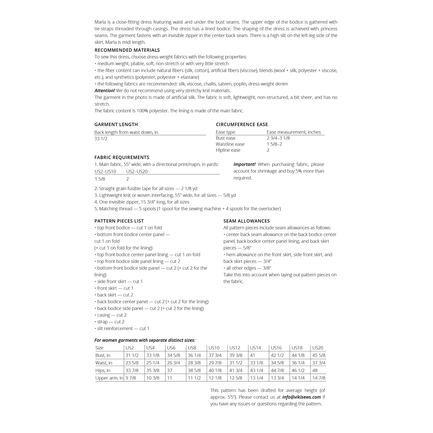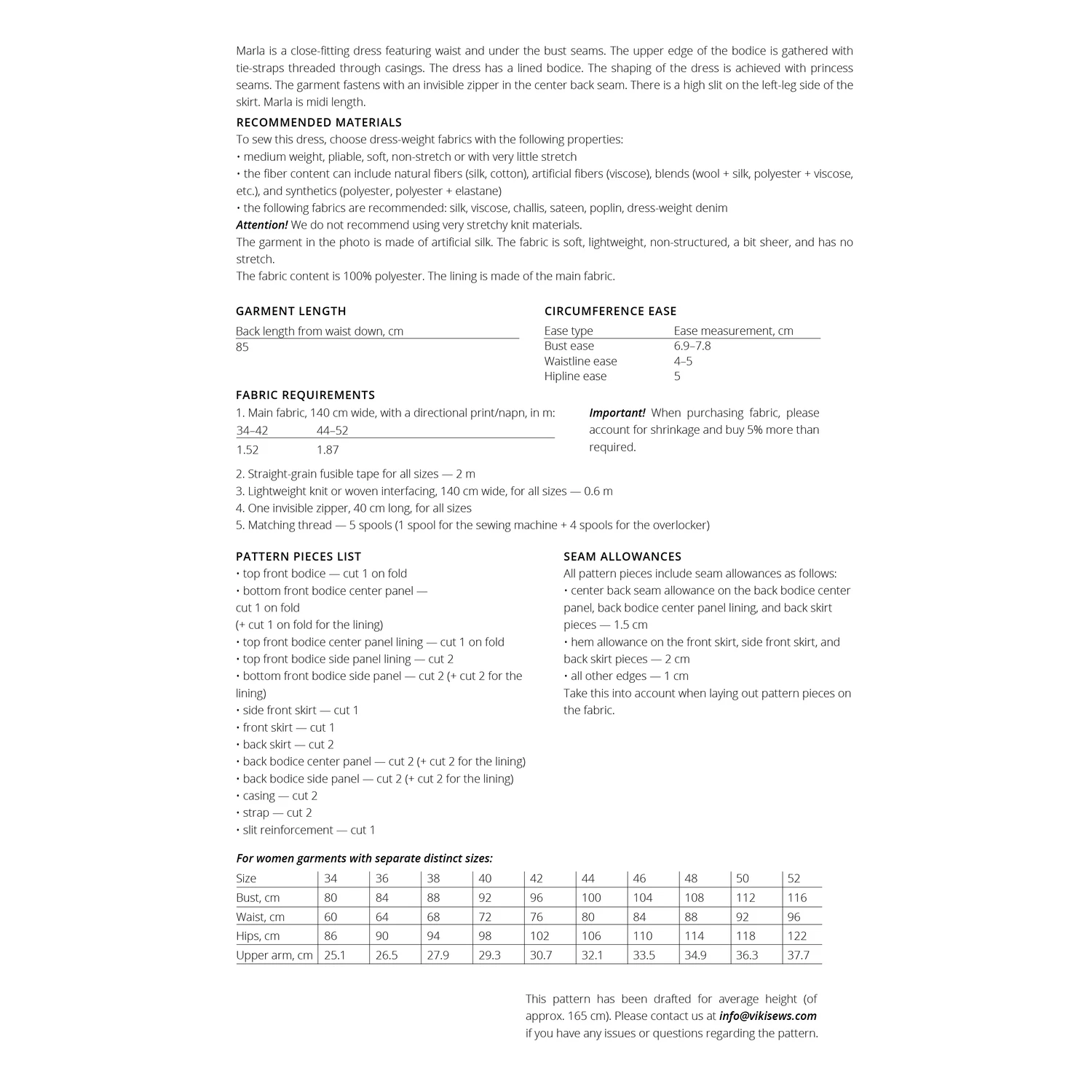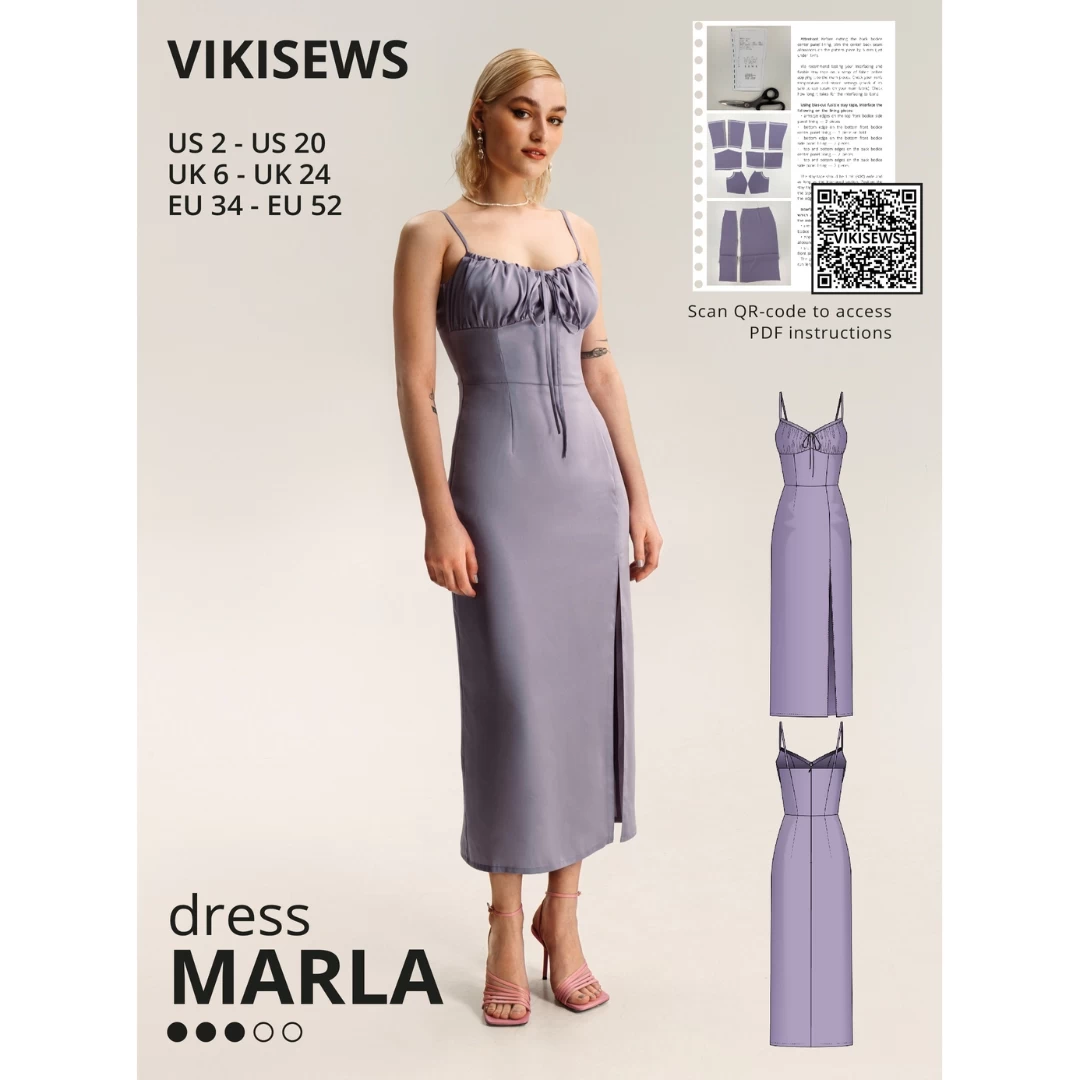 Marla is a form-fitting dress with waist and under-bust seams, a gathered bodice with tie-straps, princess seams for shaping, and a lined bodice. It closes with an invisible zipper at the centre back and features a high slit on the left-leg side, falling to a chic midi length.