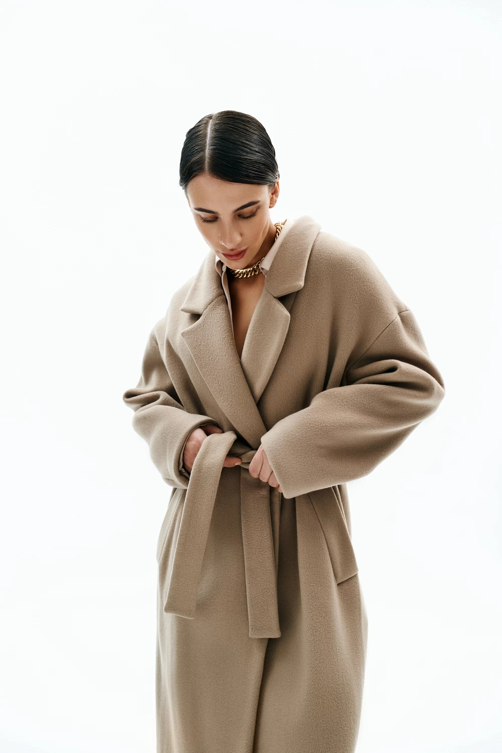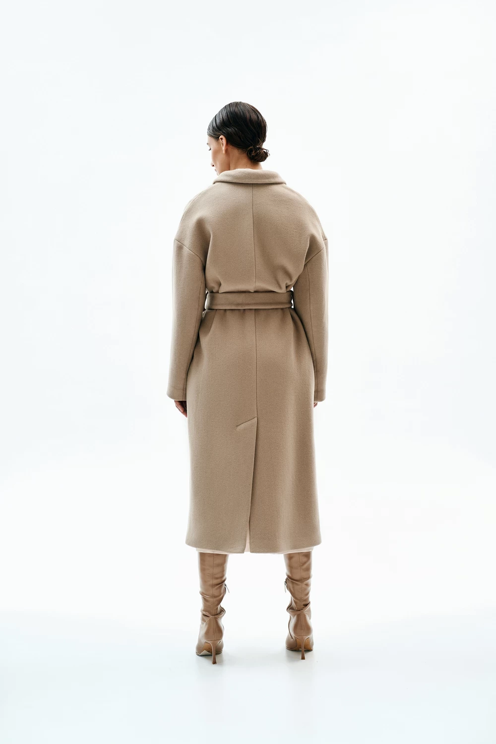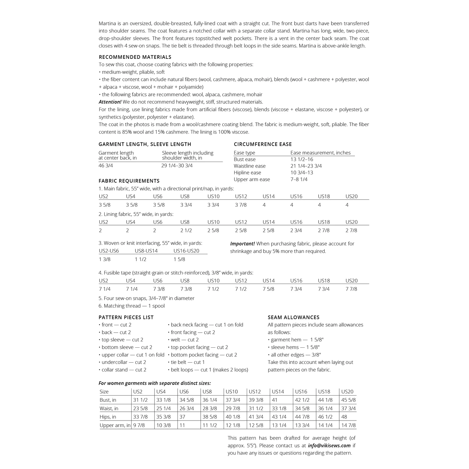 Martina is a fully-lined, oversized, double-breasted coat with a straight cut. It incorporates shoulder seams instead of front bust darts, a notched collar with a separate collar stand, and long, wide, two-piece, drop-shoulder sleeves. The front includes top stitched welt pockets, a vent in the centre back seam, and closure via 4 sew-on snaps. A tie belt is threaded through belt loops in the side seams, and Martina falls elegantly above the ankle.