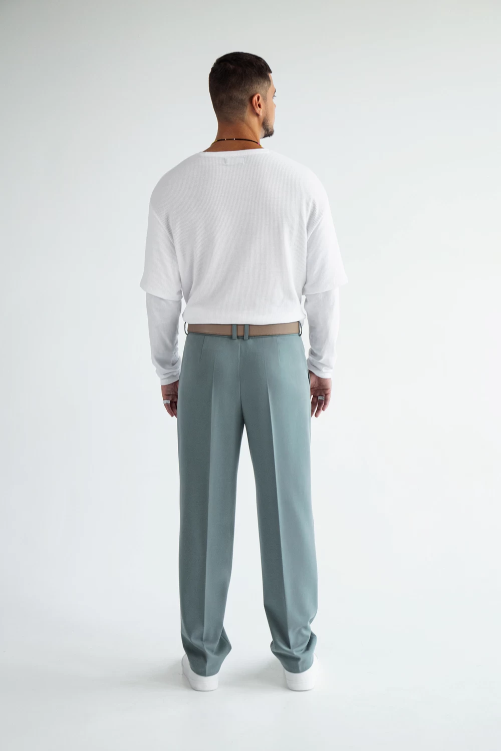 Oliver is a men’s pair of semi-fitted trousers, straight in shape with a gradual taper towards the hem. They exhibit pressed crease lines on both the front and back. Waist darts shape the back, while the front showcases functional slash pockets and waistline pleats. These trousers are equipped with a waistband that includes belt loops and sits just below the natural waistline. Fastened by a classic fly front zipper and a hook and bar eye closure on the waistband, Oliver’s length extends just below the ankles.