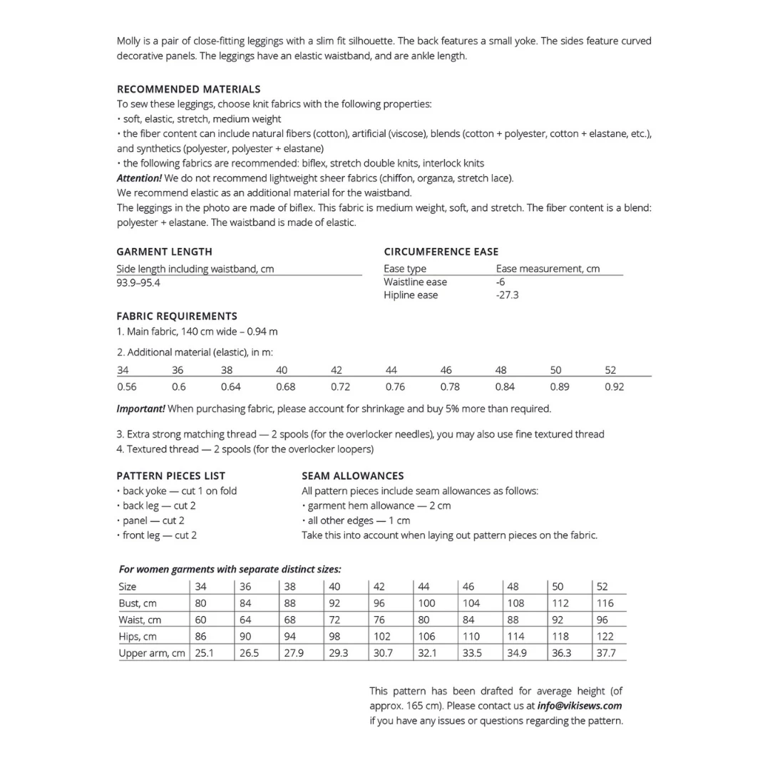 Molly is a pair of slim-fitting leggings with a yoke at the back and curved decorative side panels. They have an elastic waistband and reach ankle length.