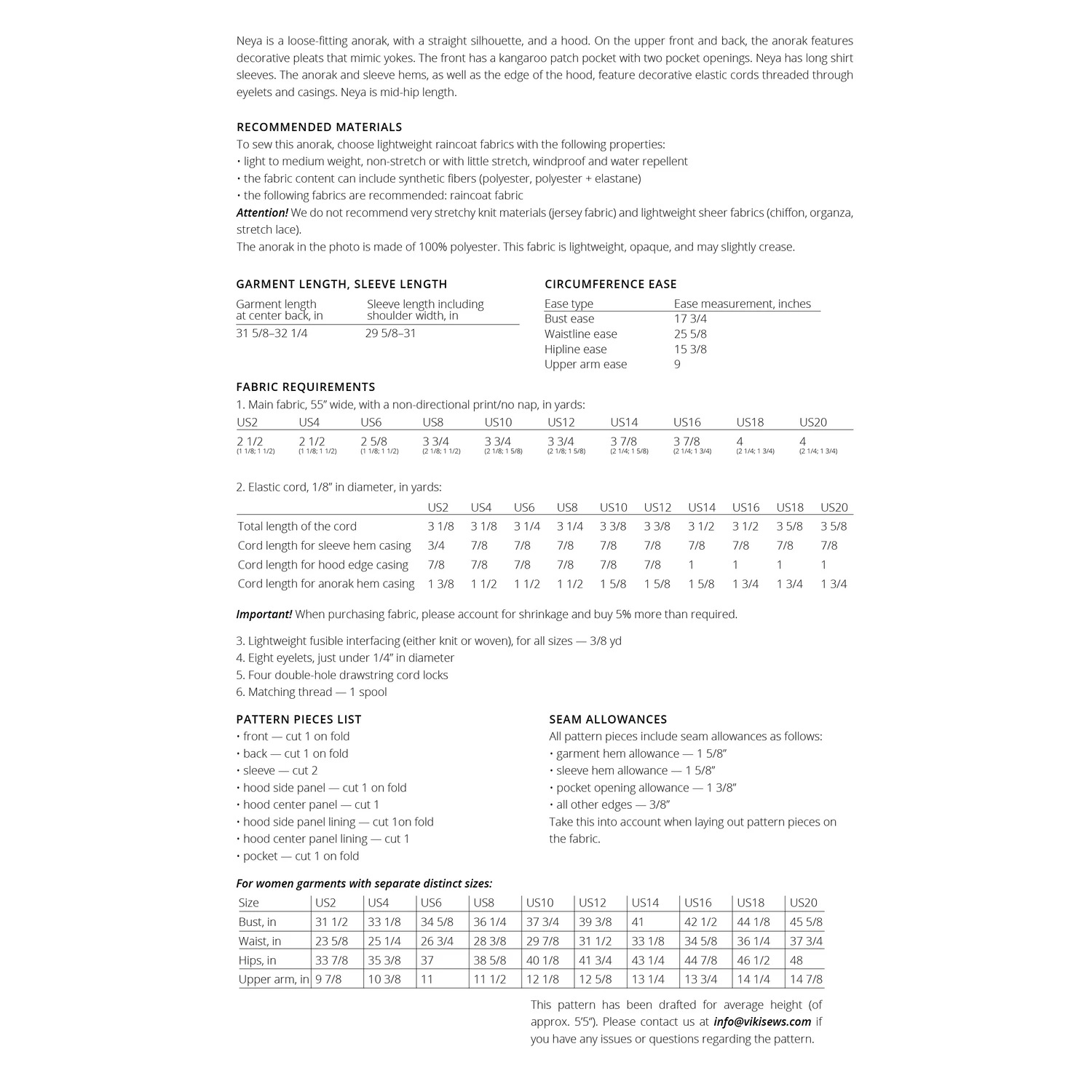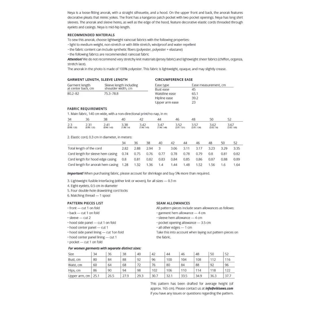 Neya is a relaxed anorak with a straight silhouette, hood, and decorative pleats resembling yokes on the upper front and back. The front showcases a kangaroo patch pocket with dual openings, while Neya has long shirt sleeves. The anorak and sleeve hems, along with the hood’s edge, incorporate decorative elastic cords threaded through eyelets and casings. Neya reaches mid-hip length.