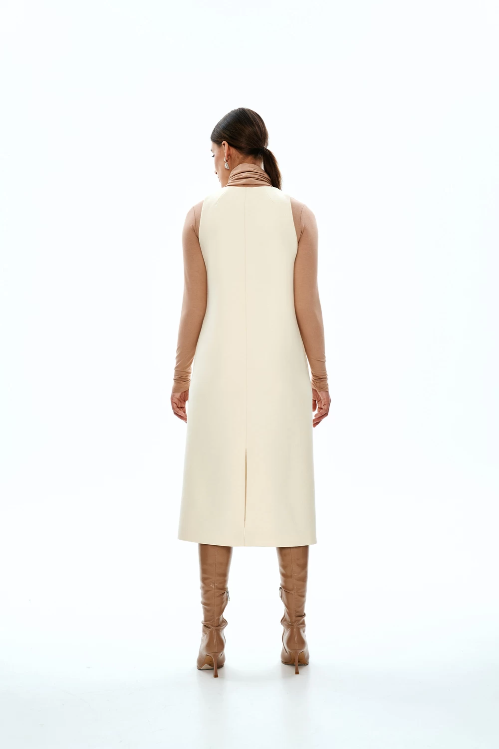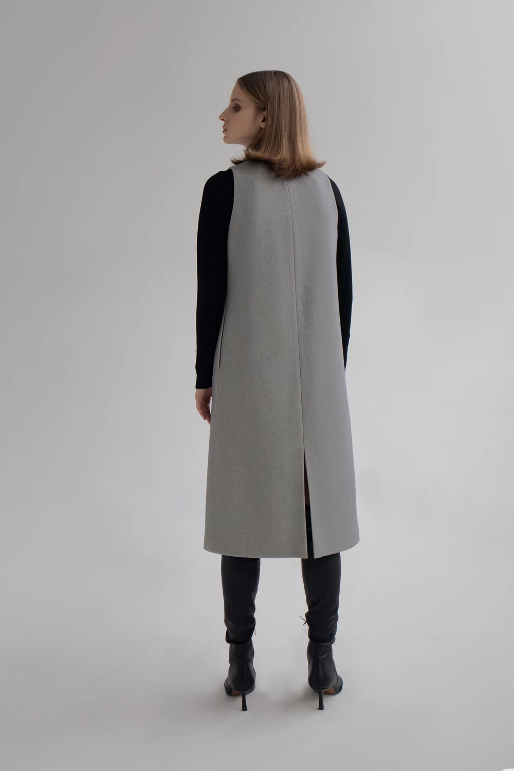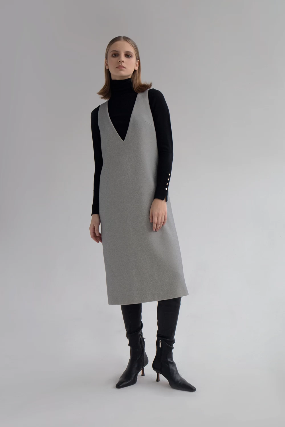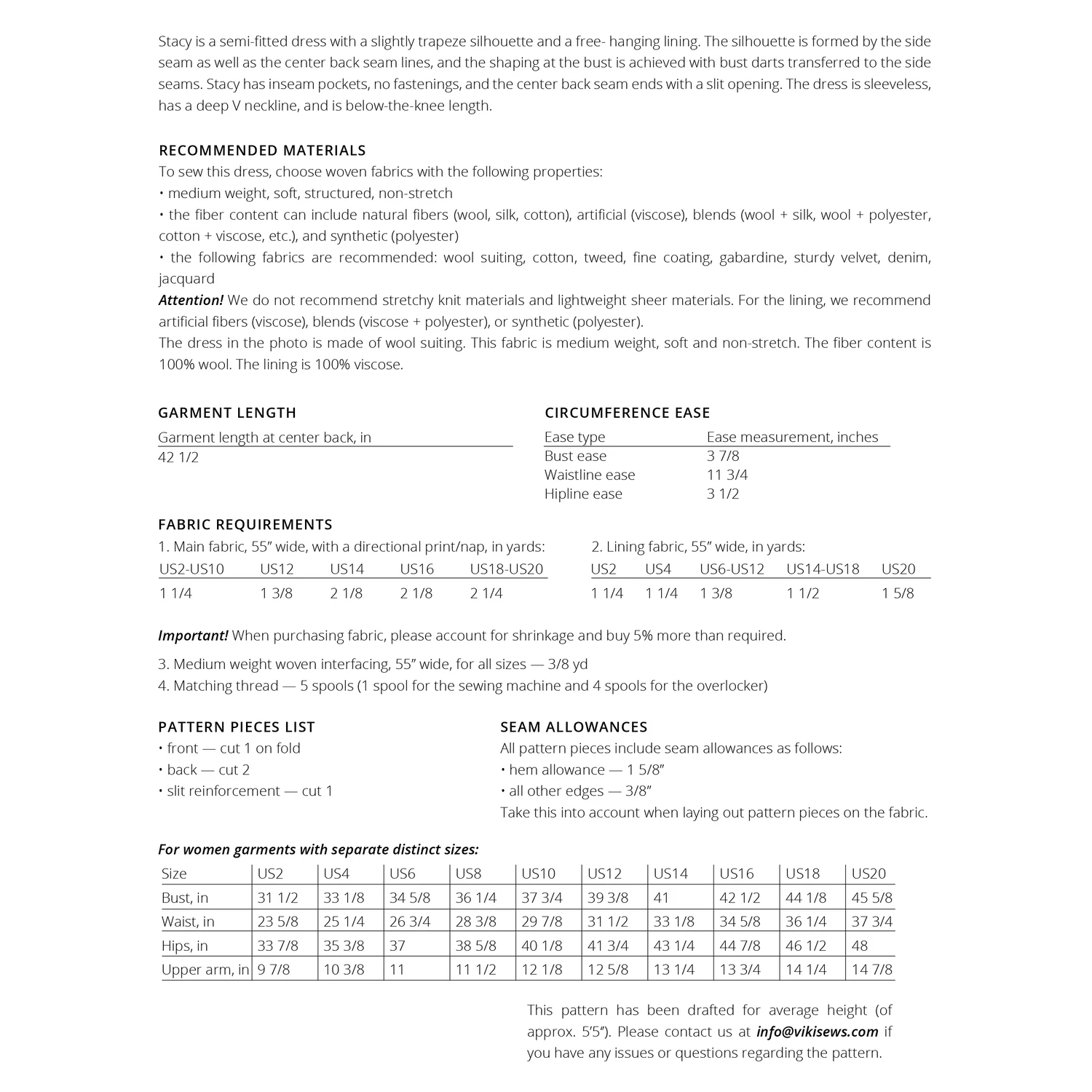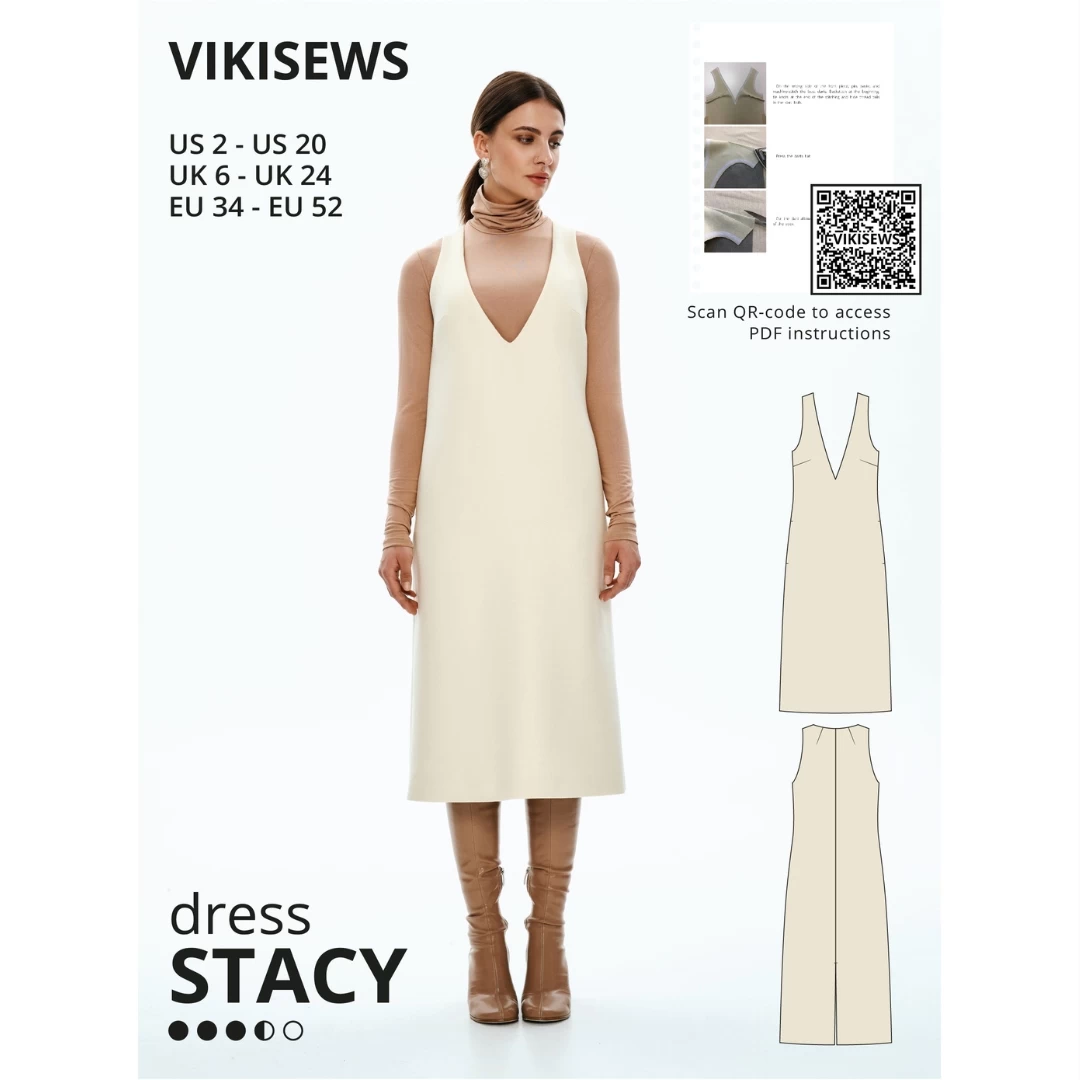 Stacy is a semi-fitted dress with a subtle trapeze silhouette, featuring a free-hanging lining. The dress’s shape is defined by the side and centre back seams, with bust darts moved to the side seams. Stacy includes inseam pockets, lacks fastenings, and concludes with a slit at the centre back seam. It is sleeveless, boasts a deep V neckline, and falls below the knee.