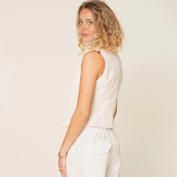 The Pika vest serves as a versatile layering piece or stylish stand-alone top. Combining fashion and functionality, it boasts a pointed front hem, decorative welts, princess seams, back darts, and a contoured back seam. Enhanced comfort is ensured with its lining and facings.
